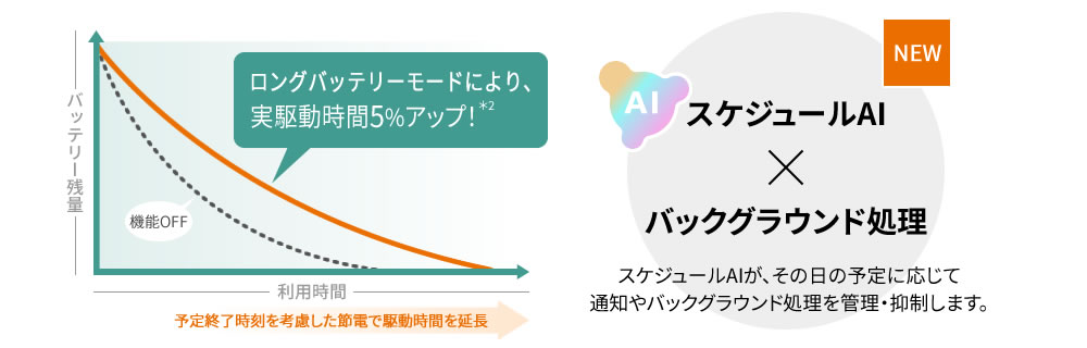 スケジュールAIがその日の予定を把握し、バッテリーが長くもつよう消費電力を自動でセーブします。モニタ輝度の調整やバックグラウンド処理・通知の抑制といった業務の生産性に影響を与えない節電で、バッテリー駆動時間を延長します*1。