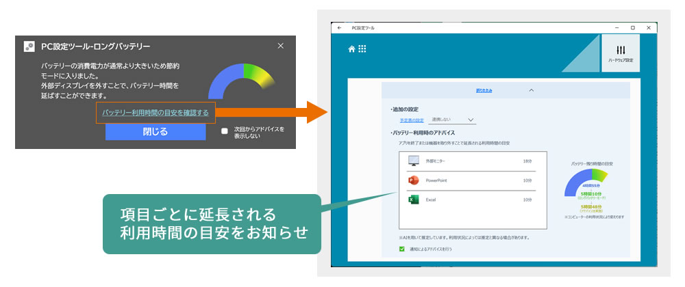 さらに、AIが通常よりもバッテリーを消費している接続中の周辺機器や長時間起動したままのアプリを検知し、バッテリー節約のためのアドバイスを行います。