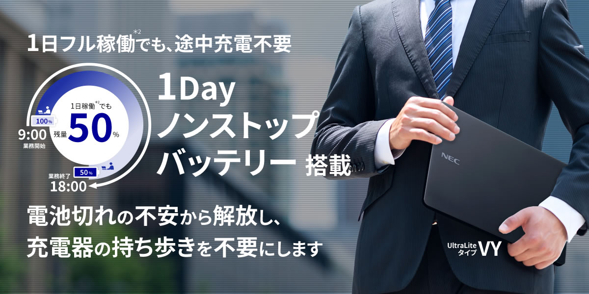 NECの独自技術により、軽さと薄さを維持したまま、長時間&長寿命バッテリーを実現しました。