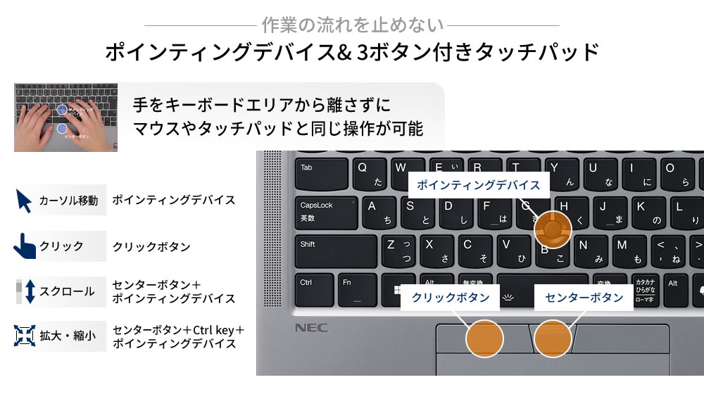 キーボード部に搭載したポインティングデバイスにより、文字/数値入力をしながらスムーズにカーソル操作が可能。操作毎に手の位置を変えずに済むため表作成などの作業効率が向上します。また、タッチパッド上部に3つの機能ボタンを装備しているため、外付けマウスを利用しなくてもマウス同様の左右クリックや画面スクロール、拡大縮小表示といった操作を容易に行うことが可能です。さらに、キーボード部にも入力のしやすさや静音性を考慮した設計を採用しています。