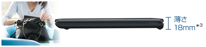 スリムデザインの側面から底面に向けて丸みを持たせた手にやさしい設計。 薄さを保ちながらも持ちやすく、さらに鞄に入れやすくなった軽量スリムエッジ筐体。薄さ18mm*1、軽量約947g*2