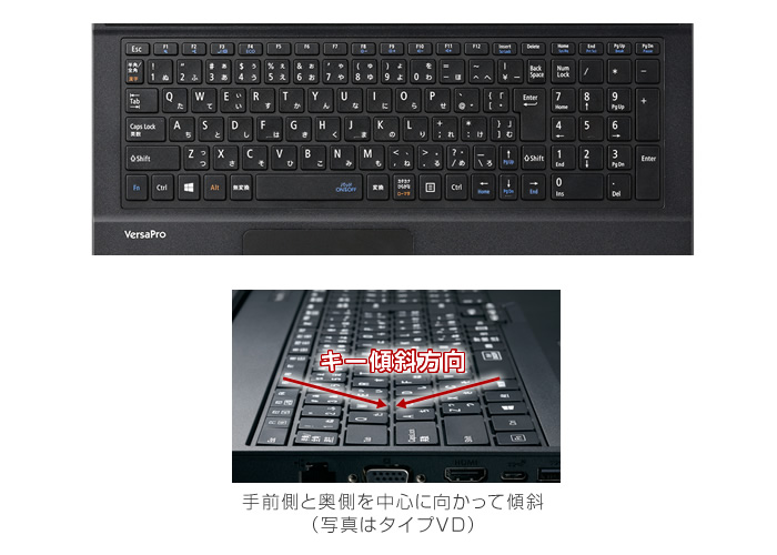 表計算や数字入力が多い作業に適した4列テンキー付きアイソレーションキーボードを標準搭載。キーボードの手前側と手前側と奥側を中心に向かって傾斜させる設計や親指で触れる回数の多いスペースキーなどを凸形状にするといった、スムーズなタイピングをサポートする細かな工夫を施しています。