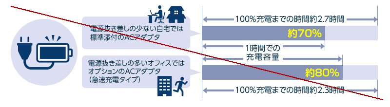 選択可能なACアダプタは2種類ご用意。急速充電対応の小型軽量ACアダプタは通常の小型軽量ACアダプタ(約203g)に比べて約210gの軽量性でありながら約1時間で容量の約80%の充電が可能。小型軽量ACアダプタとの併用でテレワーク時のオフィスと自宅の充電環境の使い分けにより効率的な業務を支援します。