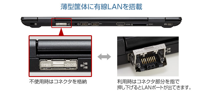 インターフェイスを背面に集中装備。机の上で周辺機器を接続する場合でも横や前のスペースを確保することができます。 さらに薄型筐体ながら格納型の有線LANポートを搭載。その他 充電機能を備えたUSB 3.0ポート(Type-C)やHDMIポートなど充実のインターフェイスを装備しています。また、HDMIからVGAへの変換アダプタも選択可能です。