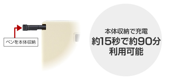 付属のデジタイザーペンは、自然な書き心地を可能にする筆圧感知*1に加え、充電機能を装備。本体収納と同時にスピーディに充電*2が行え、約15秒充電で約90分利用が可能です。