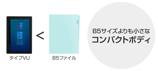 鞄に入れての持ち運びにも適したB5ファイル以下のコンパクトボディ(259.2×175mm)に加え、本体質量約640g、薄さ11.2mmと、とてもスリム&スタイリッシュ。営業端末としてはもちろん、テレワークなど卓上でのセカンドマシンとして扱いやすいサイズです。