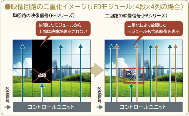 映像および電源回路をそれぞれ二重化し、冗長性を確保。万が一特定のLEDモジュールが故障※した場合でも、映像回路が二重化されているためにマルチスクリーン映像を表示し続けることができ、表示トラブルを最小限に抑えることができます。また、電源ユニットを2系統装備しているので、もし電源トラブルが発生しても映像を表示し続けることが可能です。