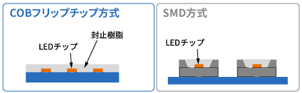 LEDチップを基板に直接接着し封止樹脂で全体を覆う、COBフリップチップ方式を採用。ピクセルカードの表面全体が樹脂で保護されているため、SMD方式に比べて外部からの衝撃や静電気、埃、水滴などへの耐性が向上しています。そのため室内通路やエントランスなど、人が触れることが想定される場所にも設置が可能です。