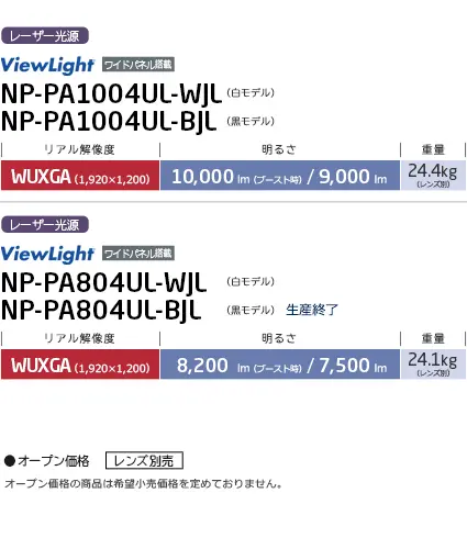 レンズセットモデル ViewLight NP-PA1004UL-W41 高輝度10,000lm※の長寿命レーザー光源を採用。