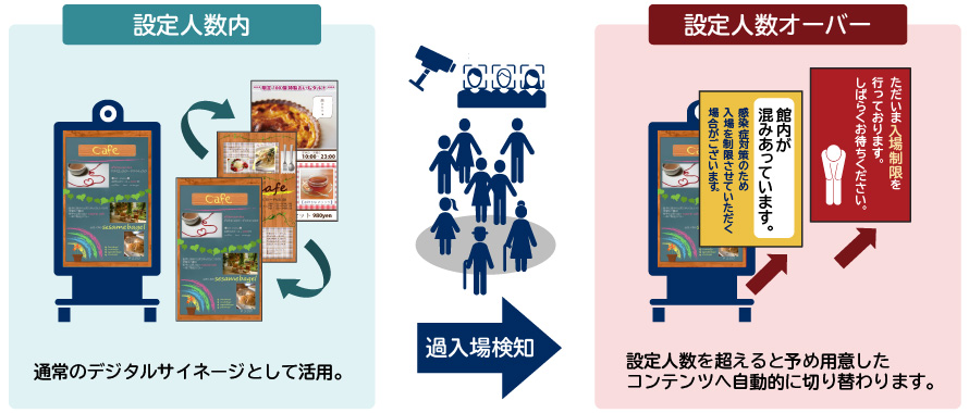 通常のデジタルサイネージ活用に加えて、入場者が設定人数を超えた際にはコンテンツの自動切り替えによる注意喚起・警告画面を表示可能。入場制限など即時の対策を実施することができます。