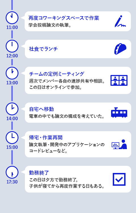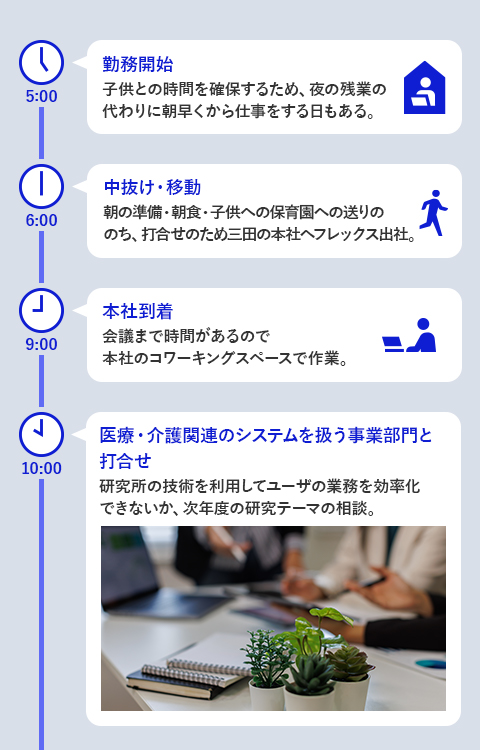 このときに体験した研究所の雰囲気が大学の研究室に似ていて、「昨夜は論文の投稿で夜遅くなったから」と先輩が遅めに出社してくるなど、スーパーフレックス制(注1)ならではの自由さがあって良い環境だなと思っていたのです。