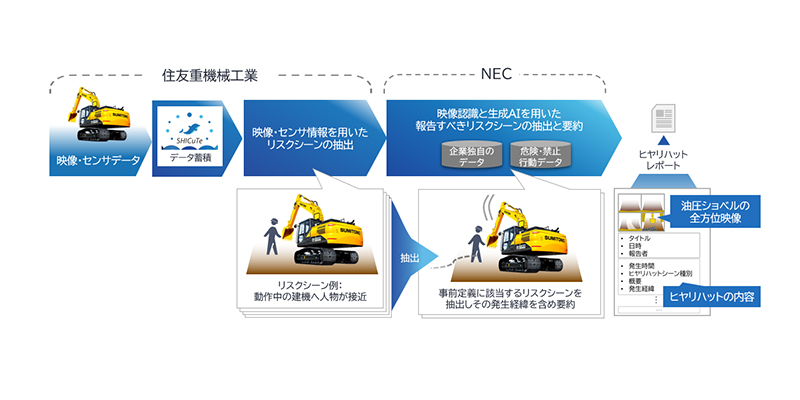 NECでは2026年4月から住友重機械と協力し、建設現場の安全性向上に向けた新たな技術の共同開発を実施します。2025年には既に技術検証を完了しており、NECが開発した最先端技術である映像認識AI×LLM(注2)を活用し、住友建機製の油圧ショベルから取得した映像やセンシングデータを解析する技術的な実現可能性を検証していました。膨大な時間を記録したデータの中から油圧ショベル周辺で発生したヒヤリハット事象を自動検出し、その内容を文章として要約。さらにレポートを自動で作成し、現場への的確で効率的なフィードバックを可能にするという本技術。今後は、その実装に向けた取り組みが始まります。新たなスタートを前に、その開発背景や技術的な工夫、そして今後の展望について、両社の研究者に詳しく話を聞きました。