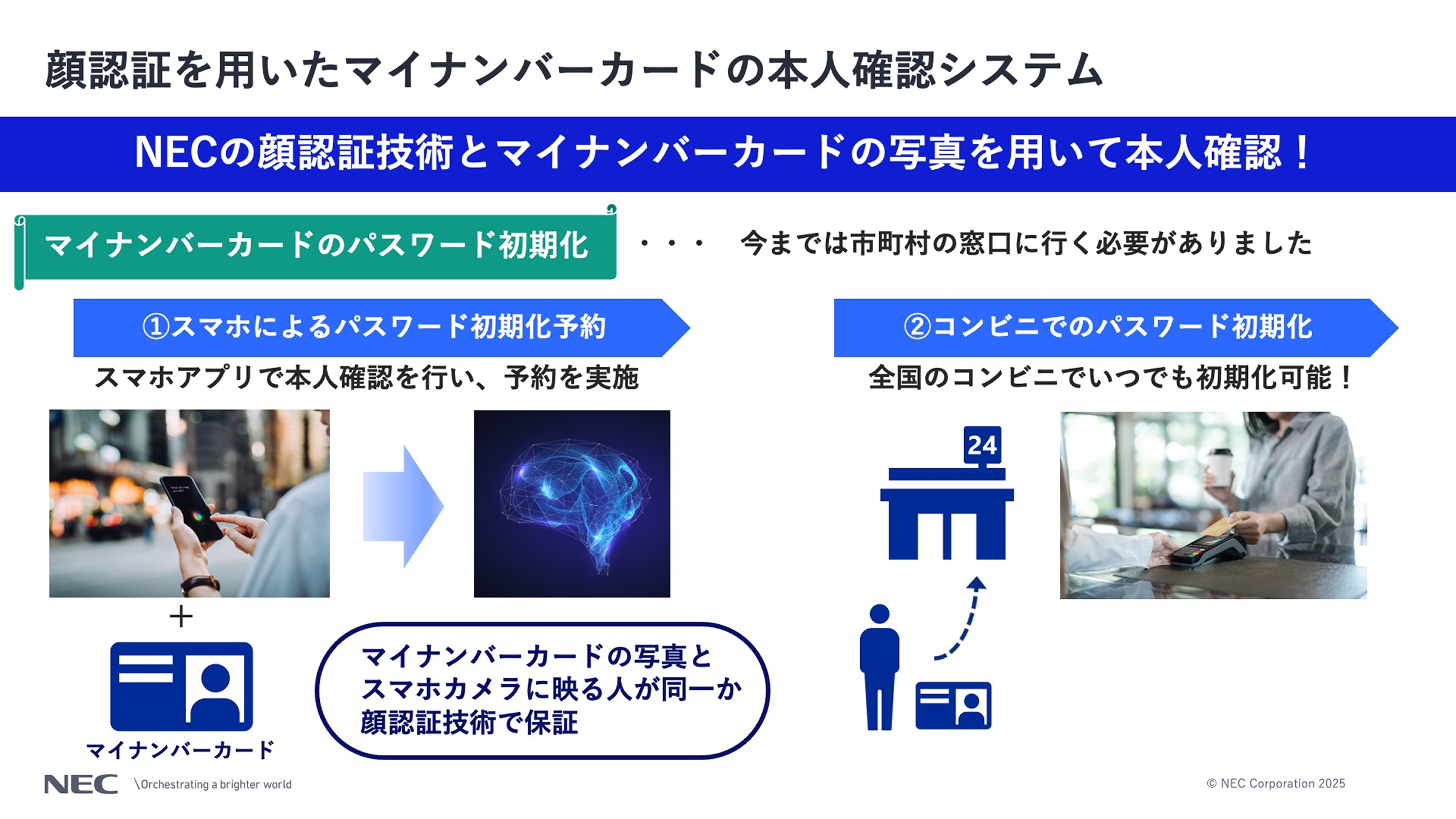 安全かつ手軽にパスワードが変更できるよう、スマートフォンのカメラに映った本人の顔とマイナンバーカードの写真を顔認証技術を用いて比較することで本人認証を行い、本人であることが確認できたら、スマートフォンからパスワード初期化の予約が行えるようにしました。さらにパスワードの初期化を市町村の窓口まで行かずに、近隣のコンビニに設置している端末から行えるようにしました。