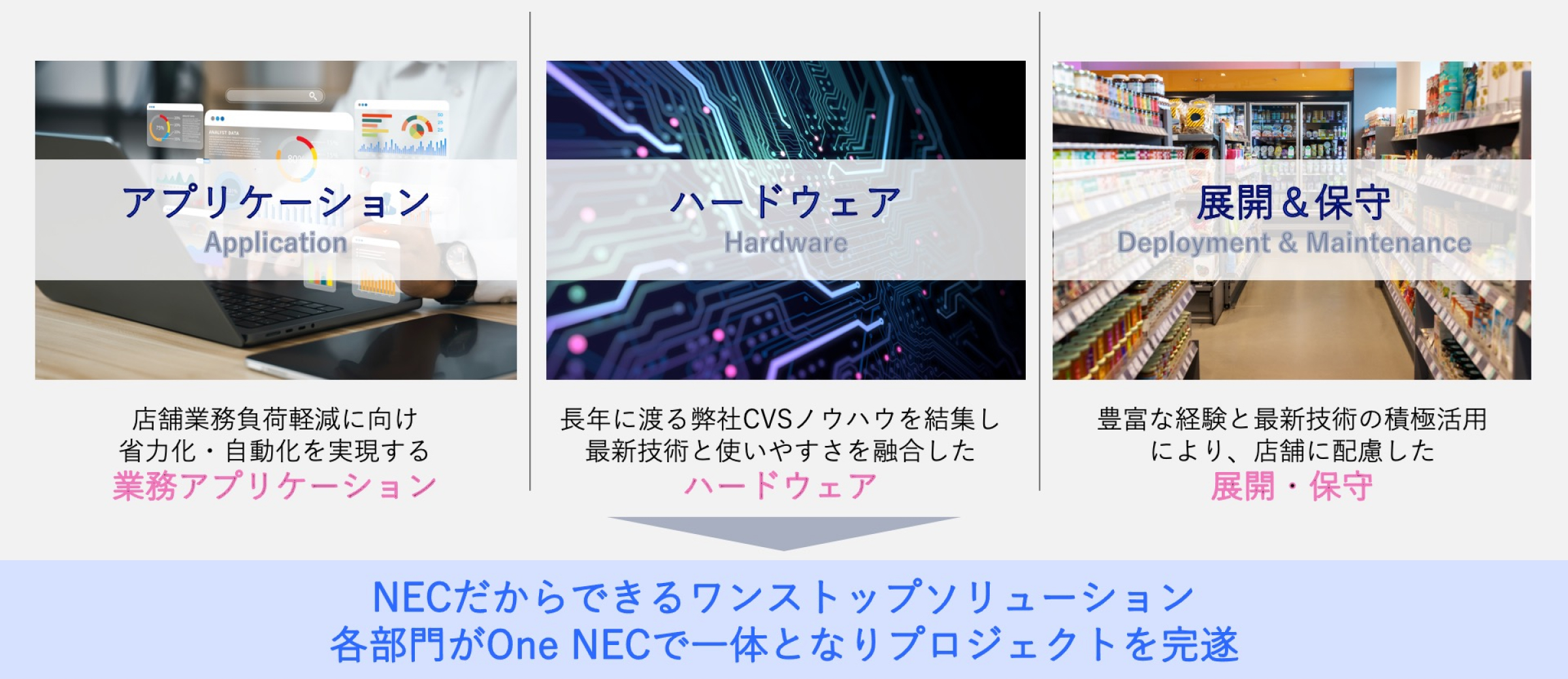 当部門だけでなく、ハードウェア製造部門や展開・保守部門とOne NECで一体となり、コンビニエンスストアの店舗運営をシステム面から支援し、お客さまの社会価値創造に貢献しました。
