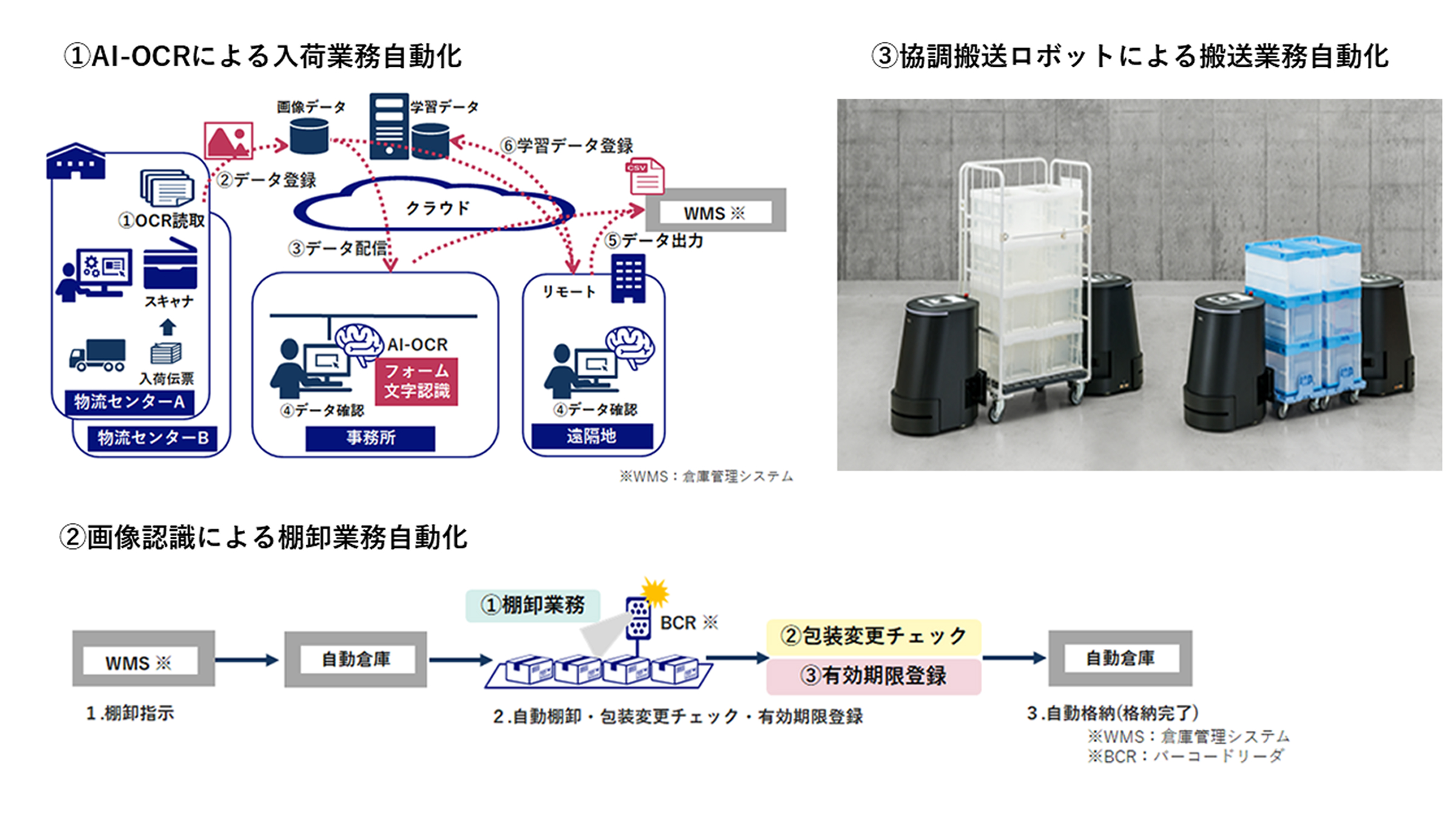 解決策①AI-OCR、②画像認識、③協調搬送ロボットというNECの先端技術を活用し、物流品質・生産性の向上に向けた庫内作業の自動化・省人化を実現しました。