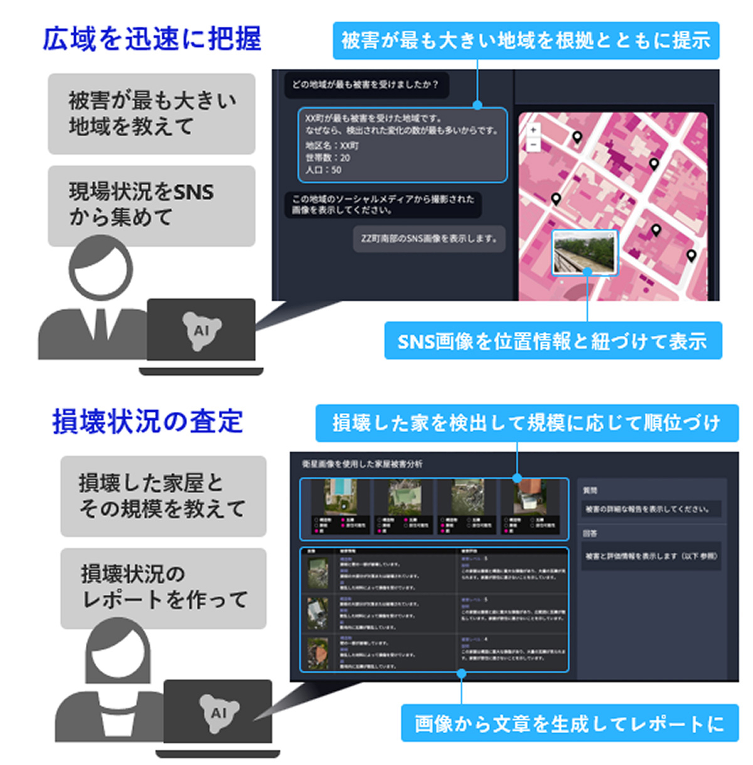 衛星画像解析と大規模言語モデルを組み合わせることにより、専門家でなくてもチャット形式で欲しい情報を入手する技術を開発しました。災害前後の衛星画像を比較することで広域で変化を捉え、災害発生時にどこで何が生じているか被災状況の迅速把握に役立てることが出来ます。また「屋根」「構造」などパーツ毎の変化を捉えることで一戸一戸の詳細な損壊状況を把握し、被災時の損害査定に役立てることもできます。今後、衛星で観測できる地球規模の広域情報と土地・建物の台帳情報やハザードマップなどの公的情報と組み合わせ災害リスクの可視化や被災予測精度の向上に取り組んでいきます。