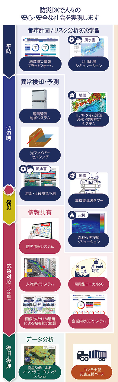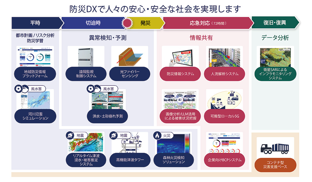 NECでは「平時」「切迫時」「応急対応時」「復旧・復興時」の4つの局面に加え、平時、災害時問わずご活用いただける防災DXソリューションをご提供しています。