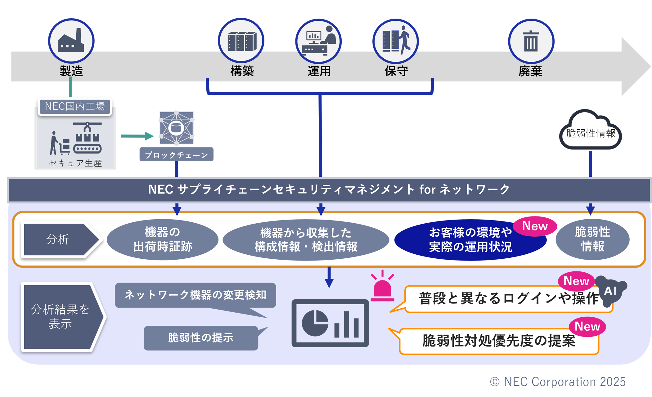 NEC、AI技術活用などによるネットワーク機器セキュリティ運用コスト低減機能を追加した「NEC サプライチェーンセキュリティマネジメント for ネットワーク」の新バージョンを販売開始