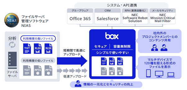 「それらの課題に対してNECはファイルサーバ統合管理ソフト『NIAS(NEC Information Assessment System)』の活用を中心としたファイルサーバの移行経験が豊富。ファイルの整理、権限管理の棚卸しと引き継ぎ、確実なデータ移行が期待できます」と三宅氏。また様々なITソリューションを扱っていることから、それらとBoxを連携させ、より効果的に使うための提案が行える点にも期待しました。