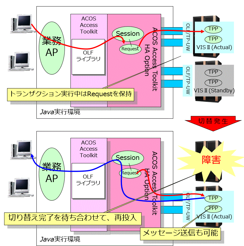 トランザクションは自動的に稼働VISへと投入されます。 - ホストの系切り替え発生時もセッション(ホストとの接続状態)は維持します。