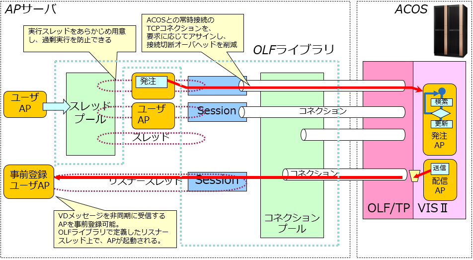 - 非同期メッセージ受信を実現できます。事前にAP(オブジェクト)を登録しておくと、メッセージ受信時に呼び出されます。呼び出された時点はそのセッションを確保した状態となり、継続メッセージの同期受信や、トランザクション要求を行うこともできます。
