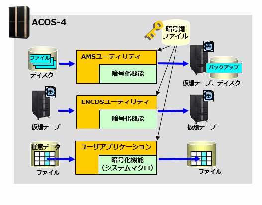 - 暗号化されたファイルは、ACOS-4でのみ利用可能ですので、ACOS-4ホスト以外とのデータ交換には利用できません。