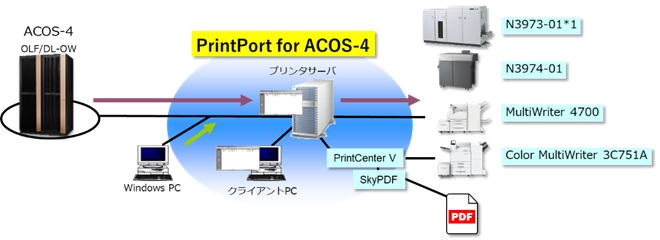 PrintPort for ACOS-4 は、ACOSとネットワーク接続された専用のプリンタサーバ上で動作し、 ACOSの基幹業務で出力されるACOS印刷データをオープン系プリンタ用のデータに変換し、印刷を行うソフトウエアです。