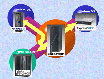 DISKSHARE & refam VXは、ACOSとオープンサーバとの間でディスクを共有し、ネットワークに負担をかけずに高速かつ安定したデータ転送を実現します。
