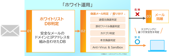 特長1. 「ホワイト運用」により、巧妙化する攻撃メールから組織を守る