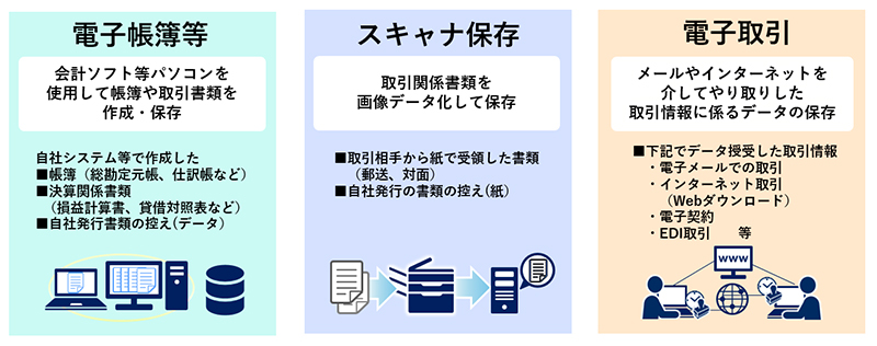 主な保存区分は、「電子帳簿等保存」「スキャナ保存」「電子取引」の3つです。それぞれ対象となる書類や保存要件が異なるため、自社の業務内容に合った保存方法を正しく理解することが重要です。以下の図では、電子帳簿保存法における3つの保存区分と、その概要を分かりやすく整理しています。