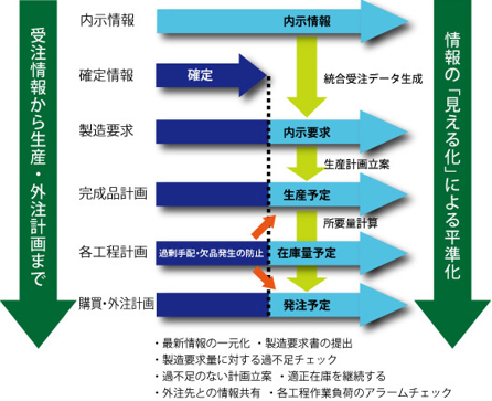 同社は従来の生産管理システムを一新し、自動車部品製造業向けERPのEXPLANNER/Jaを導入・展開。内示・確定情報を統合管理する『統合受注管理機能』を軸とする情報連携により、モノづくりのプロセス全体を見える化し、リードタイムの短縮、適正在庫の実現、納期遵守率の工場、問題点の早期は発見などを実現しています。