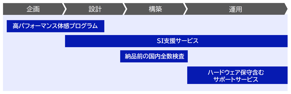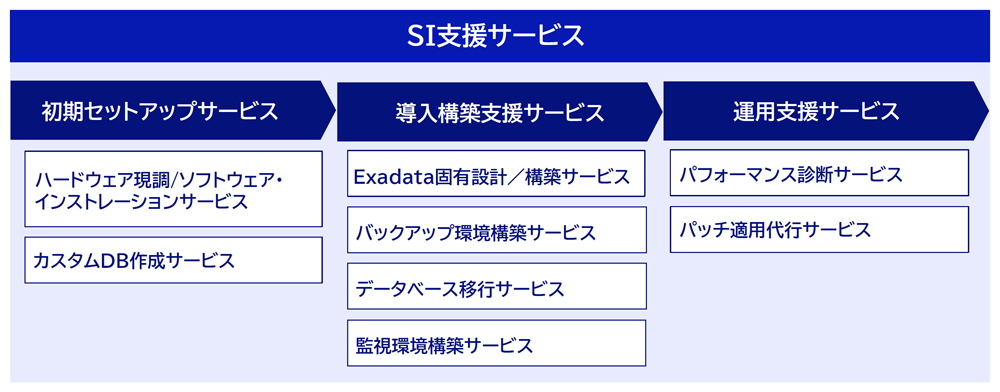 NECは、2012年よりパートナーベンダーとして国内初となるOracle Exadata向け一次保守サービスを提供しています。当該保守サービスをご契約いただいたお客様でNECグループがSIを行うプロジェクトを対象としてSI支援サービスをご提供します。