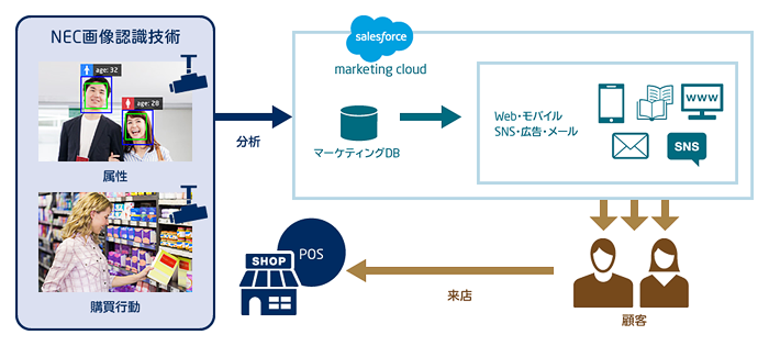Salesforce Marketing Cloudはデジタルマーケティング施策を統合的に管理するOne to Oneマーケティングプラットフォームです。このSalesforce Marketing CloudとNECの画像認識技術を組み合わせることにより、デジタルでの効果測定のみならず実店舗の効果測定を可能にするため、デジタルとリアルを融合したオムニチャネルでのマーケティング施策の立案が可能になります。