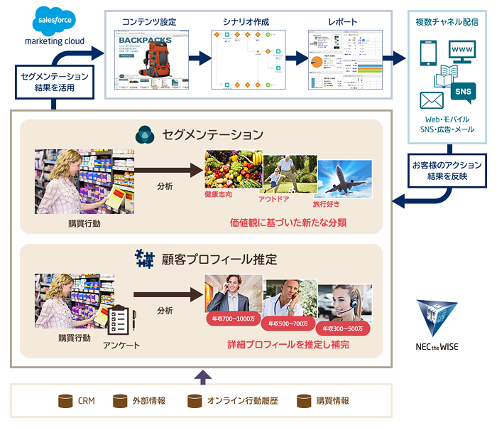 さらに、Salesforce Marketing Cloudから配信したコンテンツに対するお客様の反応を「NEC Marketing Segmentation (顧客プロフィール推定) 」に連携・再学習させることで、お客様の嗜好およびライフスタイルの変化に対応しながらお客様とのコミュニケーションが実現可能になります。
