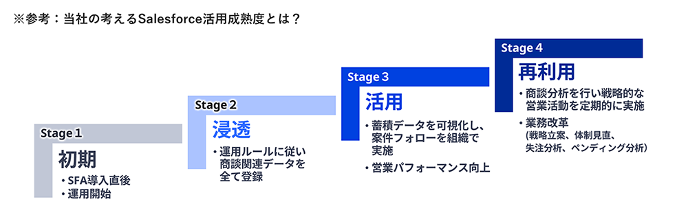 Salesforce活用成熟度を3つの観点・4つのステージで評価し見える化します。