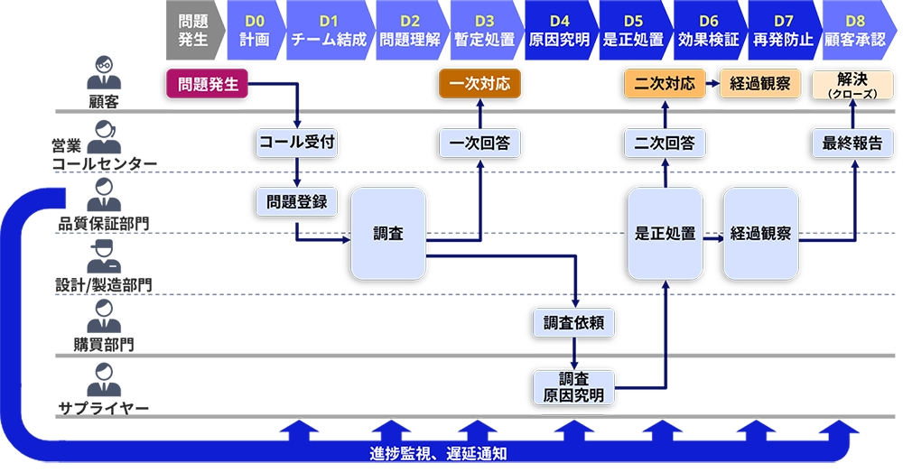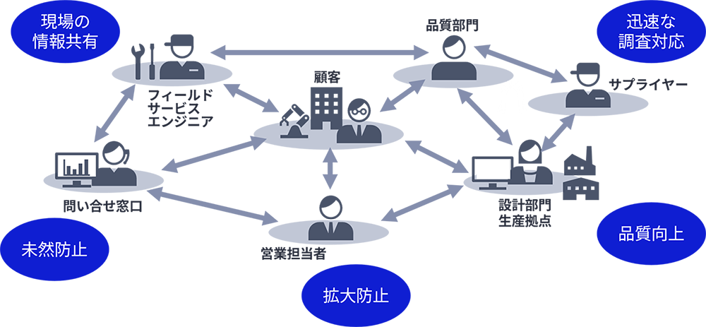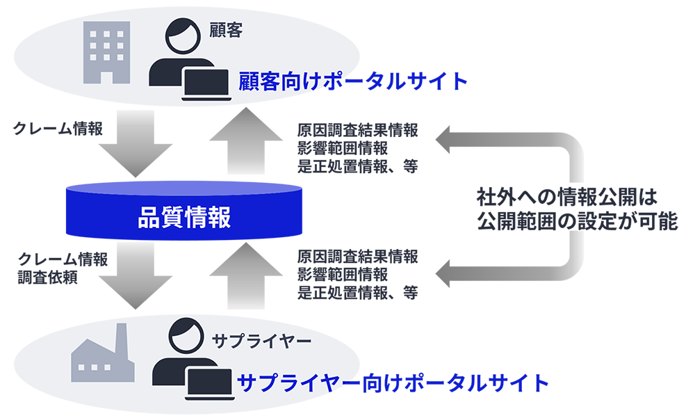 ポータルサイトを通じた部門間やサプライヤ―との情報共有することで、クレーム情報への対応・対策の迅速化を支援します。また、顧客には原因調査結果の報告だけでなく、影響範囲や是正処置を提示することで、品質管理に関する透明性確保を通じて信頼性の向上に貢献します。