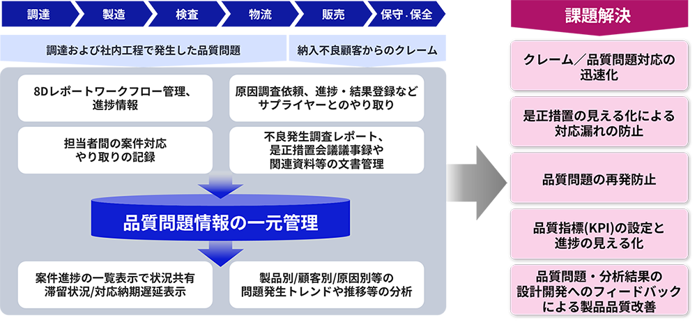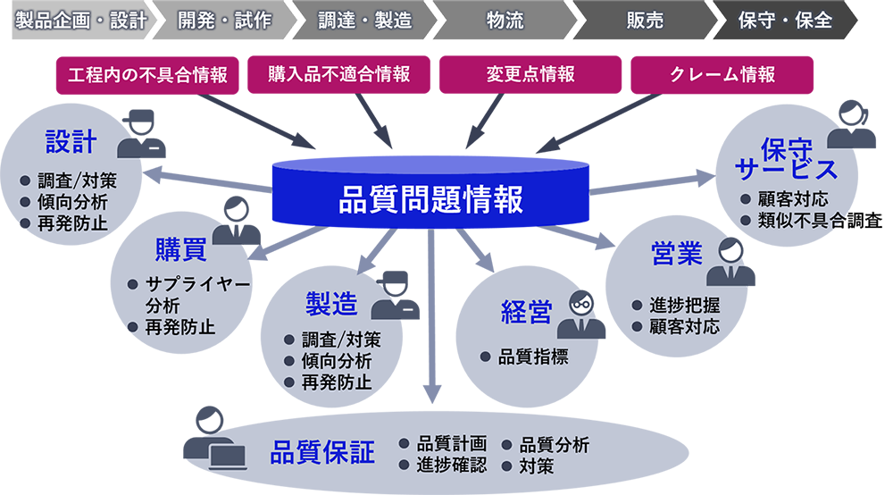 品質情報の一元管理を実現し、業務の効率化や品質情報の再利用などにより、全社一丸となる品質改善体制の構築を支援します。