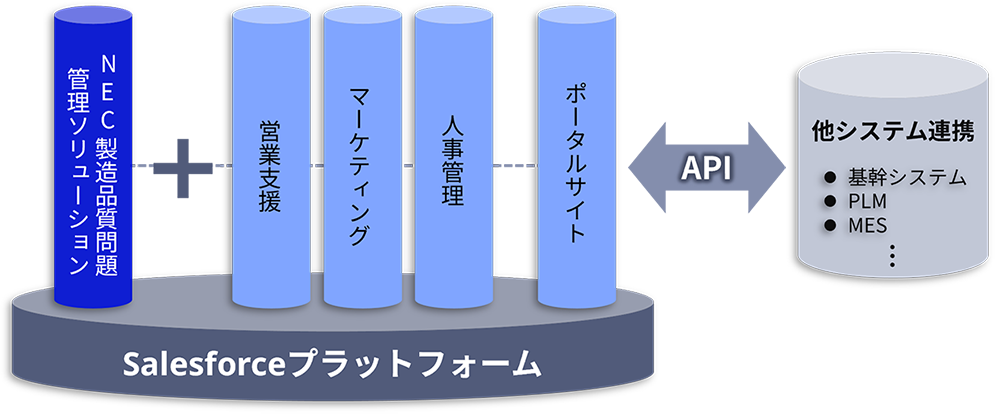 品質情報管理システムは、セキュアなSalesforceプラットフォーム上で生産管理システムのPLMやMESと連動したり、販売管理・営業支援・マーケティングなど他部門のソリューション、あるいはERPなど基幹系システムと連携をすることが可能です。