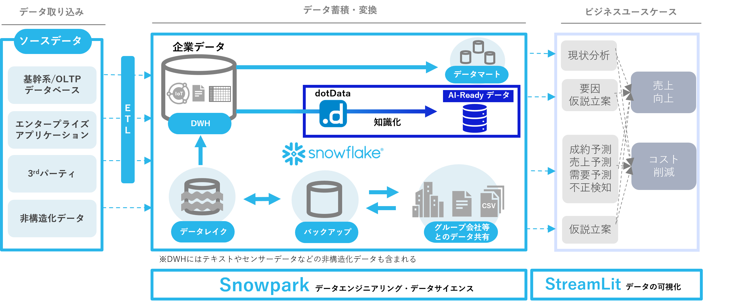 Snowflakeなどのデータ基盤に、隠れた特徴量を自動的に探索する「dotData」を組み込むことにより、企業内に蓄積されたテキストやセンサーデータなどの非構造化データを含むデータから知識(企業ナレッジ)を抽出することができます。こうして得られた知識は、AI-Readyデータとしてさまざまなユースケースに共通して活用が可能です。これにより、アジャイルなデータ利活用が可能となり、企業が持つビジネスユースケースの迅速な業務適用を実現します。