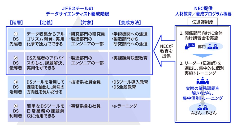NECのデータサイエンティストが製鉄プロセスや専門用語を事前に理解したうえで講義を行ったり、個別相談に対応したりするなど、伴走型の人材育成支援を提供。データ分析を課題解決に結びつける方法を最短ルートで習得している。