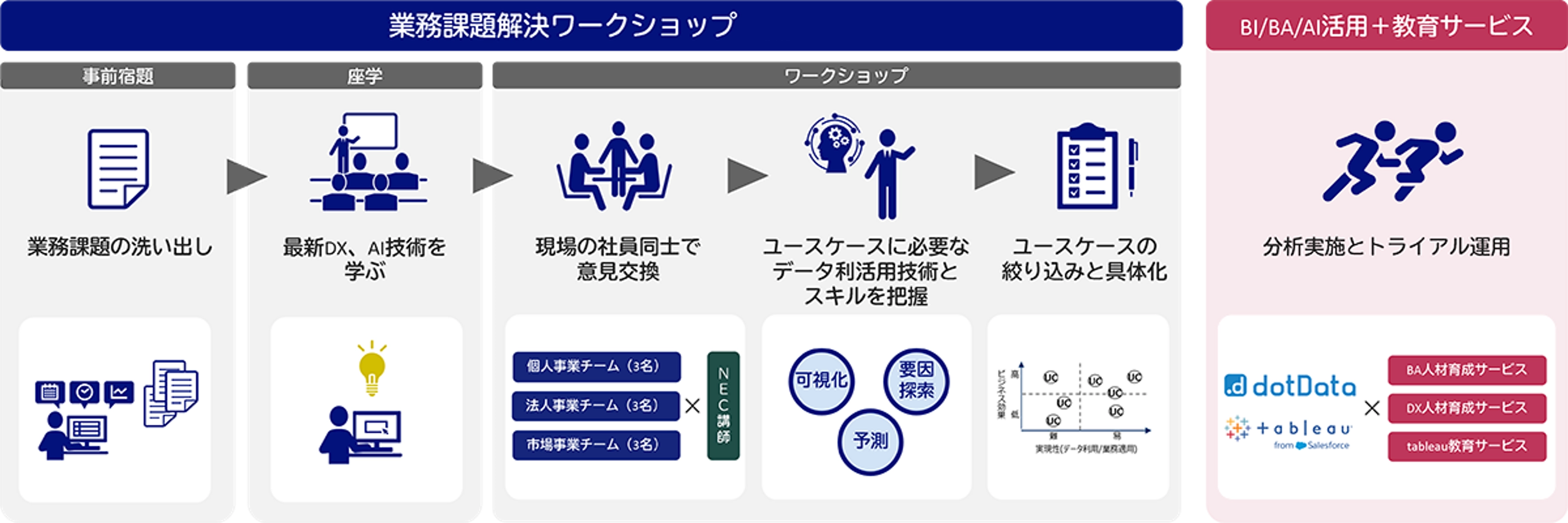 NECの業務課題解決ワークショップは、データ活用に取り組みたいと思いながらも、「ビジネス課題からデータ分析の目的への落とし込み方がわからない」「ビジネス成果が見込めるユースケースが策定できない」「どのデータ利活用技術を使えばいいのかわからない」「必要な人材・スキルは何か」といった悩みをお持ちの企業向けサービスです。本サービスでは、実際のビジネス現場での業務課題をもとに、NEC専門スタッフが豊富な経験を活かし、ビジネス成果が得られる目的(ユースケース)の策定を支援します。また、データ利活用技術の選定や取り組むべき内容、必要な人材・スキルが明確になります。