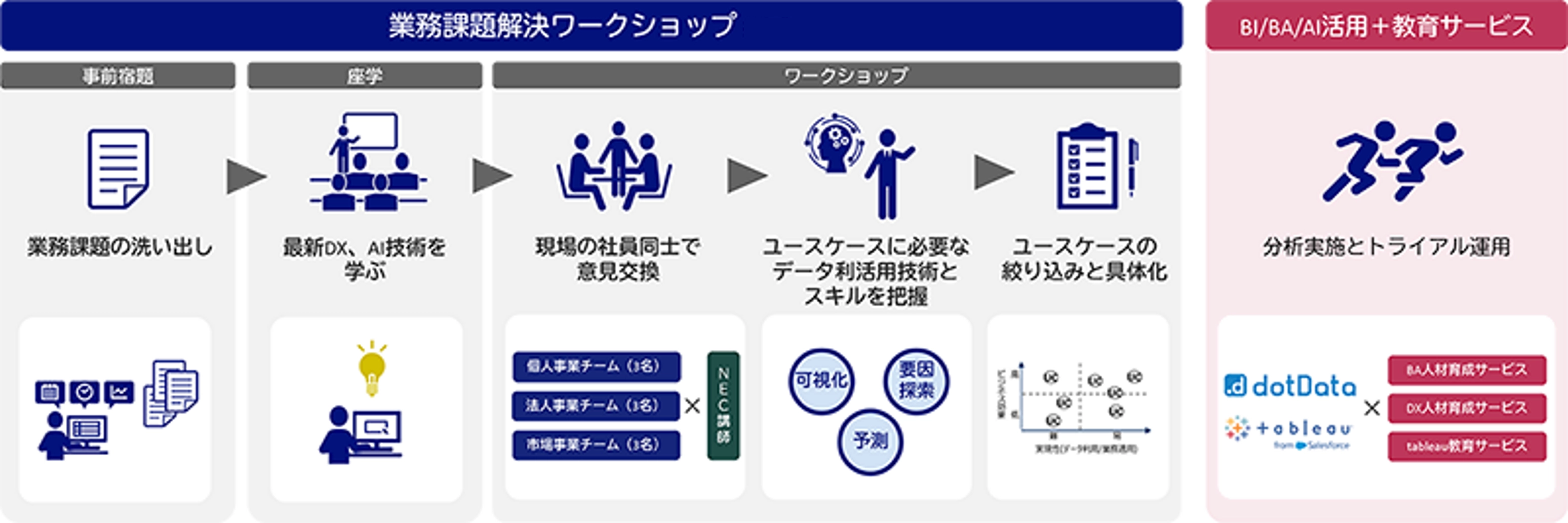 NECでは、ビジネスの具体的な課題を持っている業務部門の人材が主役となってデータ活用に取り組めるよう、AIデータ活用人材育成サービスを提供します。最先端AIデータ分析プラットフォーム 「dotData」を活用した教育により、人材の早期育成を可能にし、データ活用の内製化を実現します。