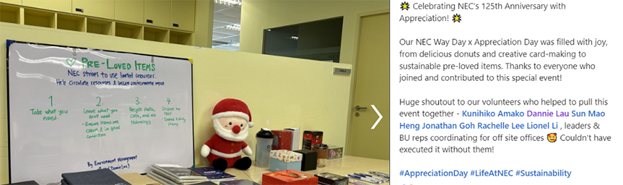 NEC APAC(シンガポール)では、環境負荷低減、資源循環への意識啓発、その機会創出のため、オフィス内に「中古品ブース」を設置し、ノートブックやバッグなど、新品で状態の良い中古品を社員が提供し、社員同士で交換したり、持ち帰ったりできるようにしました。このブースは、社員間で持続可能性の共有を促進することで、お互いに、そして地球環境に感謝することを体現しています。
