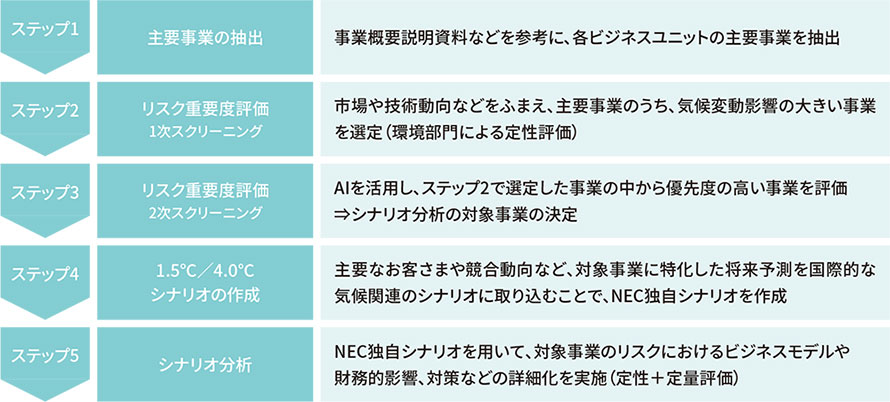 2024年度は、NECの全事業を対象に、シナリオ分析によるリスク評価を行いました。今回初となるAI活用と、環境部門によるスクリーニングを経て、企業の見通しに影響を与えると合理的に見込みうる気候関連の全社リスクと事業リスクを特定しました。環境部門が中心となり、これらリスクに対する評価を行った結果、適切な対策を取ることでどのシナリオにおいてもNECが事業継続および成長できることが確認できました。ここで得られた気候変動へのリスク対策は、各事業部門の長期の事業戦略へ順次反映させていきます。