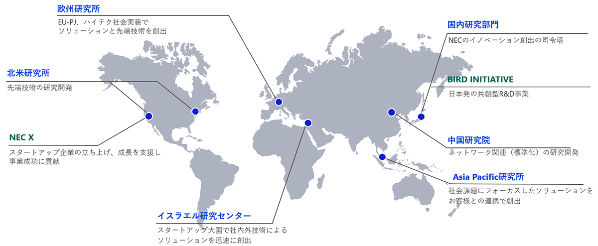 NECグループは、安全・安心・公平・効率という社会価値を創造し、誰もが人間性を十分に発揮できる持続可能な社会を目指しています。その実現に向けて、社会価値創造の軸となる既存事業を発展させる技術や、社会に新たな価値を提供しうる将来事業向けの先進的な技術を創出し、その事業化を加速することで、NECグループの持続的な発展を支えていきます。