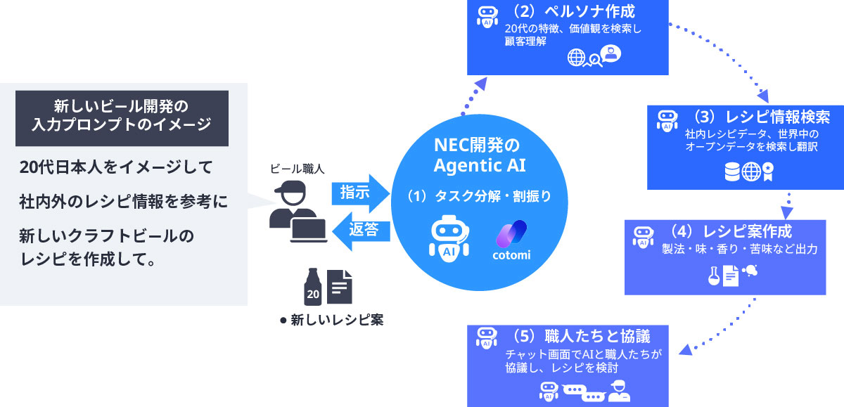 Vol.77 No.1 BluStellar特集 BluStellarが牽引するDXの未来 ~AI・セキュリティ・データマネジメント・モダナイゼーションで拓く価値創造モデル~NECはAIを人間の協働パートナーとして位置付けています。今回、ビール職人とAIが商品開発プロセスで協働し、クラフトビール「人生醸造Craft」を開発しました。NEC開発のAIコア技術「cotomi」が日本人の各世代のライフスタイルや価値観を分析し、更にcotomiをベースとしたAgentic AIとビール職人がインタラクティブに対話しながら、各世代をイメージしたレシピ案を検討しました。その結果、商品開発プロセスの作業効率が40%向上し、ビール職人とAIのそれぞれの創造能力を生かすことで、従来では生み出せなかった独創的な商品が誕生しました。本稿ではAIと人間の協働による商品開発の新たな可能性と、その具体的な取り組みについて紹介します。