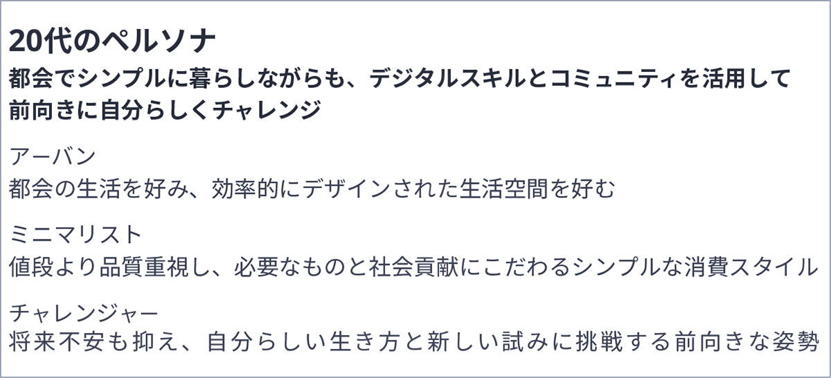 - (2)ペルソナ作成:NEC開発のAIコア技術「cotomi」を用いて、世代ごとの日本人の価値観や特徴を分析し、ペルソナを作成します。