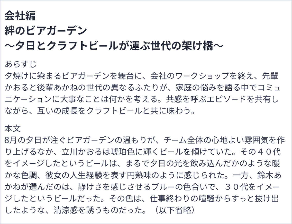 開発プロセスそのものではありませんが、生成AIを活用して販売活動に必要な商品紹介文を図5のように4つの味それぞれに作成したほか、プロモーションに活用できる小説を図6のように3本作成しています。生成AIが作成したこれらの商品紹介文や小説は、世代間コミュニケーションを促進するという商品コンセプトを消費者が理解し、具体的な商品活用シーンを思い描くことに貢献しました。