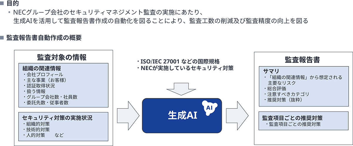 これらの課題に対応するために、NECは生成AIを活用したセキュリティ監査報告書自動生成ツールを開発しました。