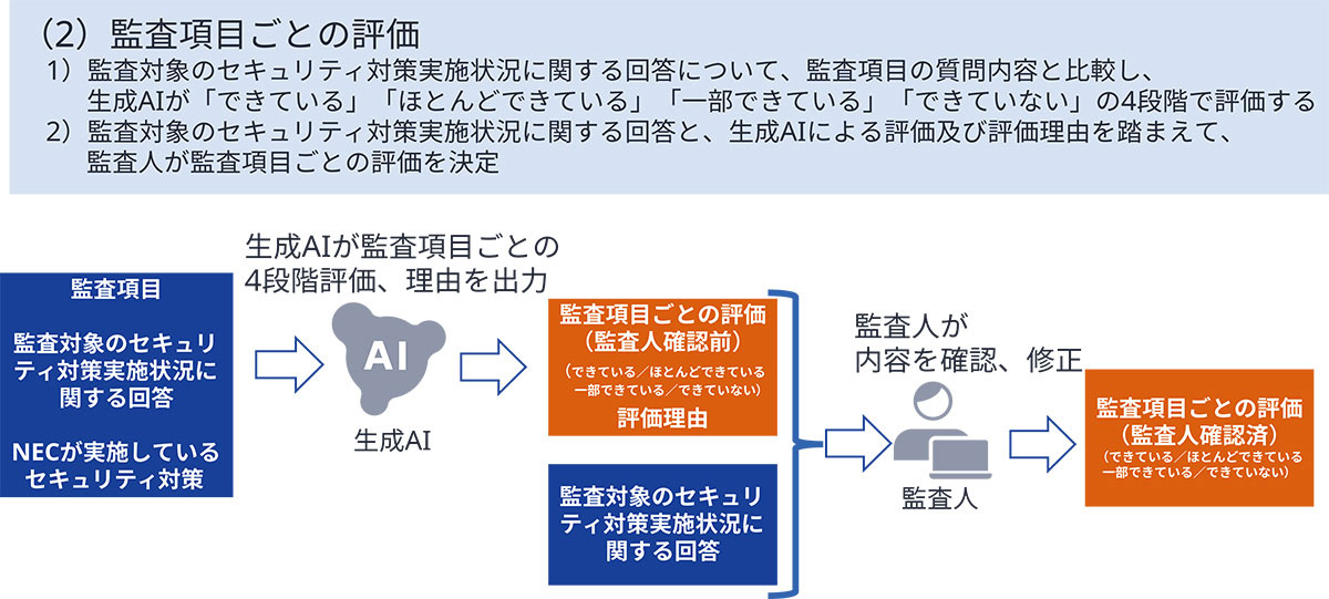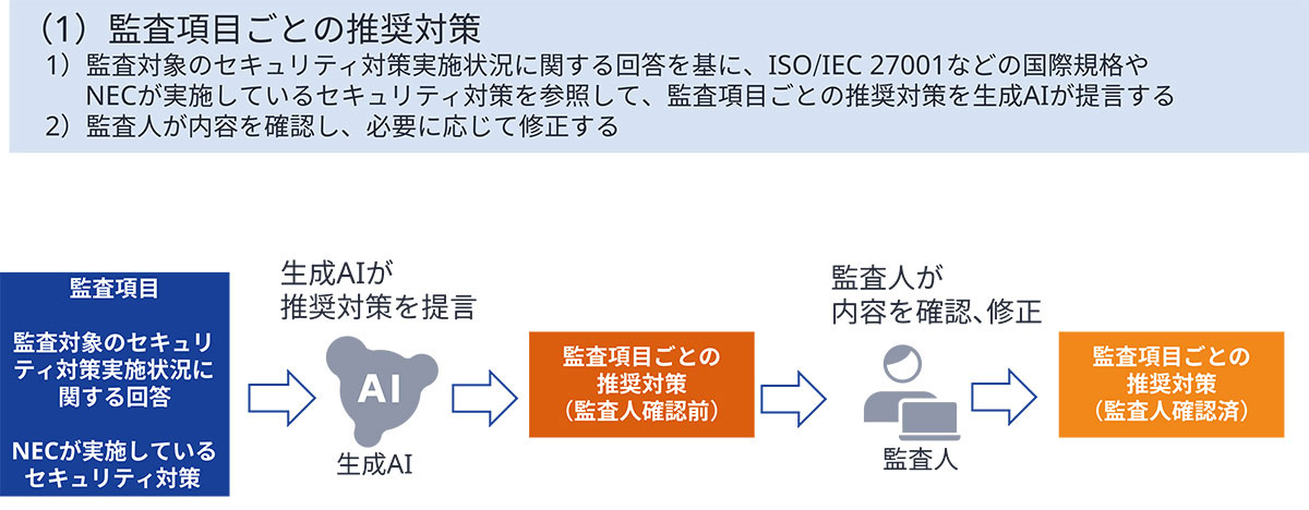 監査対象のセキュリティ対策実施状況に関する回答を基に、ISO/IEC 27001などの国際規格やNECが実施しているセキュリティ対策を参照して、監査項目ごとの推奨対策を生成AIが提言します。最終的には監査人が内容を確認し、必要に応じて修正します(図2)。